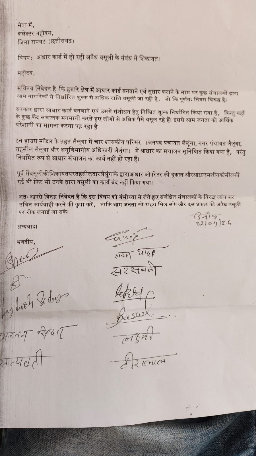 *आधार कार्ड के नाम पर लूट लैलूंगा में अवैध वसूली से जनता परेशान, कलेक्टर से कार्रवाई की मांग