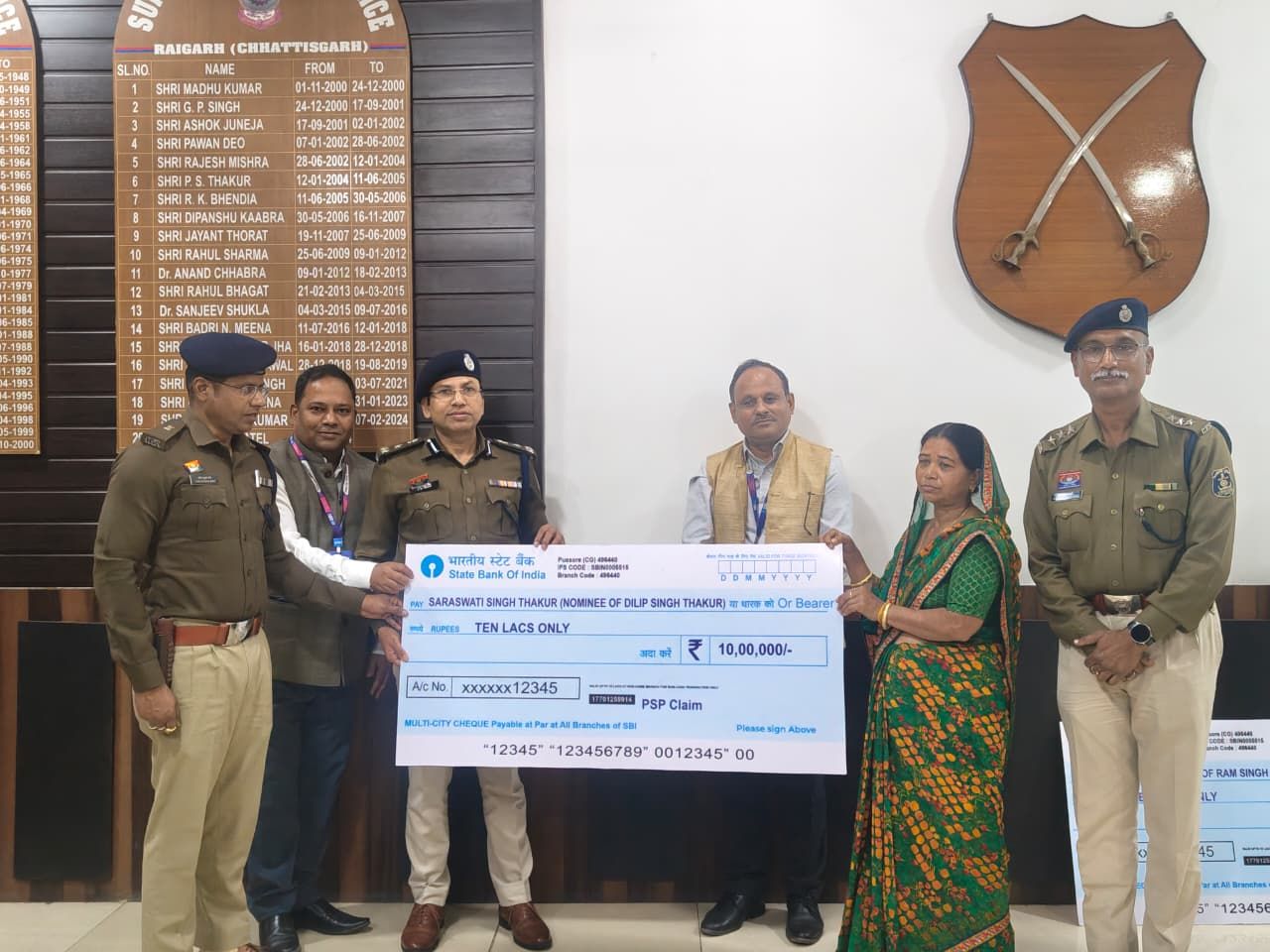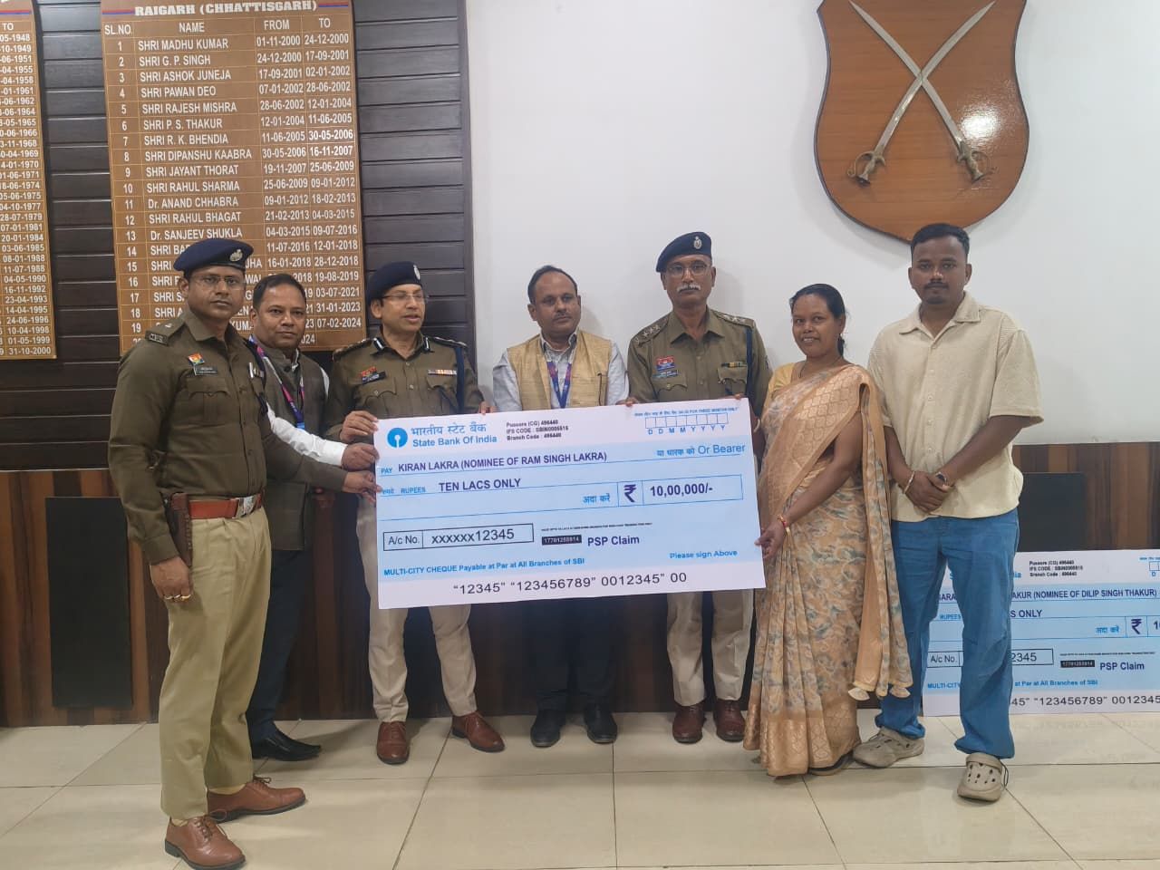 *रायगढ़, 3 फरवरी* । ड्यूटी के दौरान आकस्मिक निधन होने पर जिले में पदस्थ स्वर्गीय प्रधान आरक्षक दिलीप ठाकुर की पत्नी श्रीमती सरस्वती सिंह ठाकुर एवं जीआरपी थाने में पदस्थ स्वर्गीय राम सिंह लकड़ा की पत्नी श्रीमती किरण लकड़ा को पुलिस सैलरी पैकेज के अंतर्गत 10–10 लाख रुपये की बीमा राशि का चेक प्रदान किया गया। यह सहायता राशि वरिष्ठ पुलिस अधीक्षक शशि मोहन सिंह एवं एसबीआई शाखा पुसौर के प्रबंधक द्वारा सौंपते हुए शोकसंतप्त परिवारों के प्रति गहरी संवेदना व्यक्त की गई।