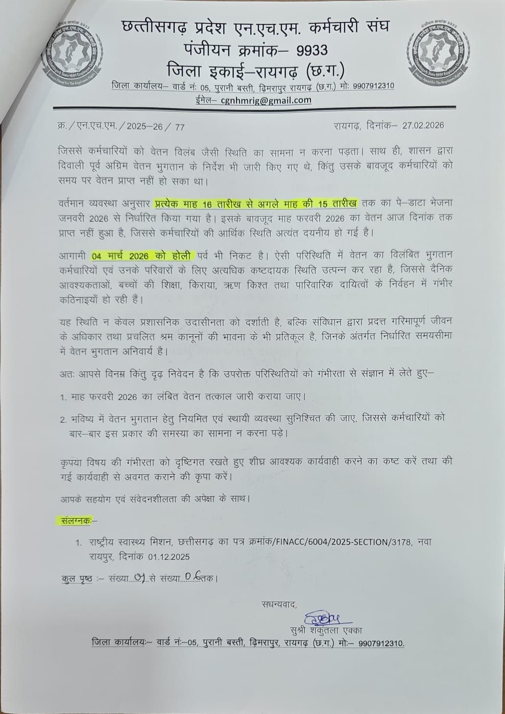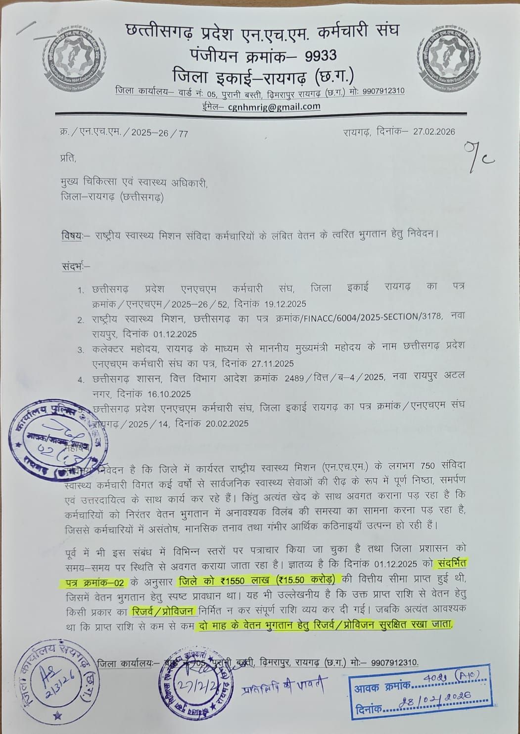 दिनांक 27.02.2026 को संघ पदाधिकारियों ने मुख्य चिकित्सा एवं स्वास्थ्य अधिकारी कार्यालय में भेंट कर वेतन भुगतान में हो रहे विलंब से अवगत कराया तथा त्वरित समाधान की मांग की। साथ ही अपने जनप्रिय विधायक एवं वित्त मंत्री श्री ओ. पी. चौधरी से हस्तक्षेप कर सहानुभूतिपूर्वक विचार करने तथा निराकरण का निवेदन किया गया है। रायगढ़ कलेक्टर से भी पत्र के माध्यम से, इस संबंध में शीघ्र भुगतान सुनिश्चित कराने का आग्रह किया गया है।
