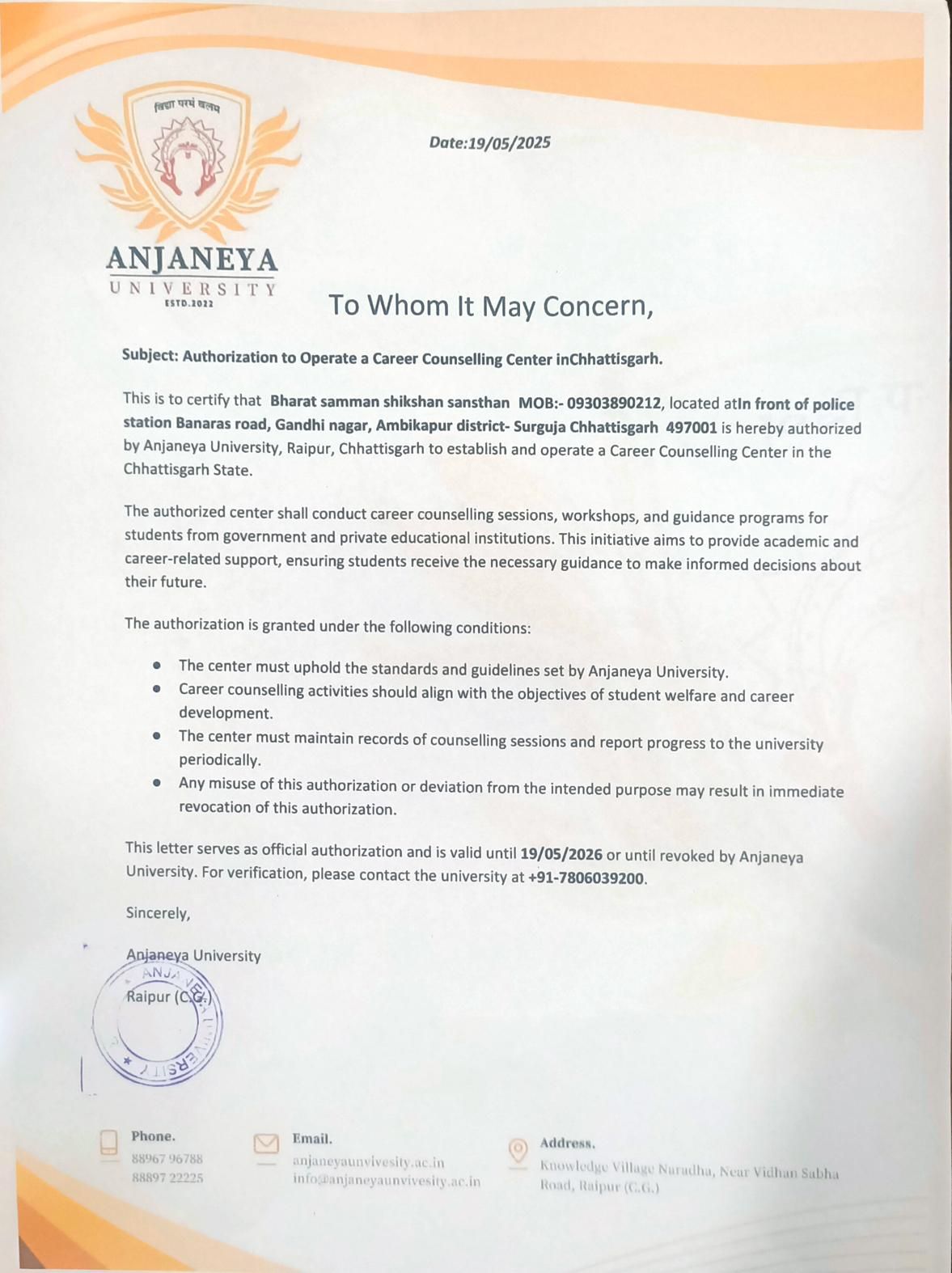 रायपुर/सरगुजा, 20 मई 2025 – प्रदेश के युवाओं के लिए शिक्षा और करियर मार्गदर्शन के क्षेत्र में एक नई पहल सामने आई है। भारत सम्मान शिक्षण संस्थान, को Anjaneya University, रायपुर ने करियर काउंसलिंग सेंटर संचालित करने की औपचारिक अनुमति प्रदान की है। यह सेंटर अब विश्वविद्यालय के दिशा-निर्देशों के अनुरूप कार्य करते हुए छात्रों को शिक्षा, रोजगार और करियर निर्माण में मार्गदर्शन प्रदान करेगा