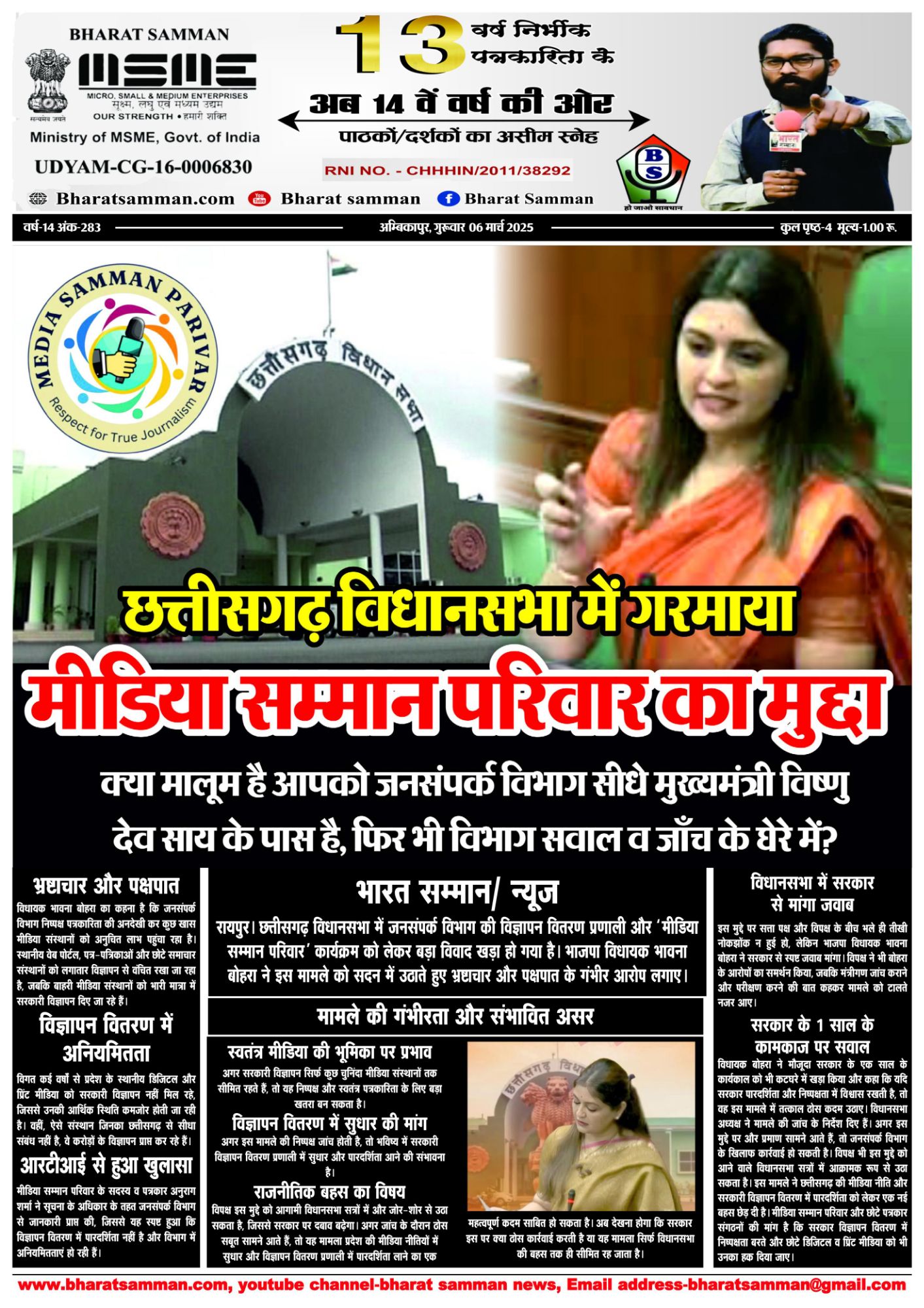 छत्तीसगढ़ विधानसभा में जनसंपर्क विभाग की विज्ञापन वितरण प्रणाली और ‘मीडिया सम्मान परिवार’ कार्यक्रम को लेकर बड़ा विवाद खड़ा हो गया है। भाजपा विधायक भावना बोहरा ने इस मामले को सदन में उठाते हुए भ्रष्टाचार और पक्षपात के गंभीर आरोप लगाए।