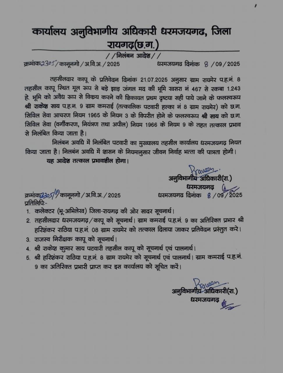 धरमजयगढ़ :- रायमेर के समस्त ग्रामवासियों द्वारा धरमजयगढ़ अनुविभागीय अधिकारी राजस्व, रायगढ़ कलेक्टर से लेकर छत्तीसगढ़ के मुख्यमंत्री तक को राकेश साय पटवारी हल्का नंबर 08 तहसील कापु के द्वारा ग्राम रायमेर के शासकीय जमीन का फर्जी पट्टा बनाकर दलालों के द्वारा फर्जी रजिस्ट्री करने को लेकर शिकायत किया गया था जिसके बाद अनुविभागीय अधिकारी धरमजयगढ़ द्वारा पत्र क्रमांक /504/अ. वि. अ./ वा.-2/2025 धरमजयगढ़ दिनांक 27/02/2025 को नायब तहसीलदार धरमजयगढ़ को मामला की गंभीरता को देखते हुए जांच प्रतिवेदन मांगा गया। वही रायगढ़ कलेक्टर द्वारा भी पत्र क्रमांक /4156/शि.शा./2025 रायगढ़ दिनांक 26/05/2025 को भी अनुविभागीय अधिकारी राजस्व को भी पत्र जारी कर जांच रिपोर्ट मांगी गई थी जिसका जांच कापु तहसीलदार द्वारा कर धरमजयगढ़ अनुविभाग अधिकारी राजस्व को दे दिया गया था। दोनों जांच रिपोर्ट अवलोकन में उनके द्वारा शासकीय कार्य के प्रति घोर लापरवाही प्रतीत होना प्रथम दृष्टिया पाया गया जिसपर धरमजयगढ़ अनुविभागीय अधिकारी राजस्व प्रवीण कुमार भगत द्वारा छत्तीसगढ़ सिविल सेवा आचरण नियम 1965 के नियम 3 के विपरीत होने के फलस्वरूप पटवारी राकेश साय को छत्तीसगढ़ सिविल सेवा नियम 1966 के नियम 9 के तहत तत्काल प्रभाव निलंबन कर वही निलंबन अवधि में निलंबित पटवारी का मुख्यालय तहसील कार्यालय धरमजयगढ़ नियत किया गया।