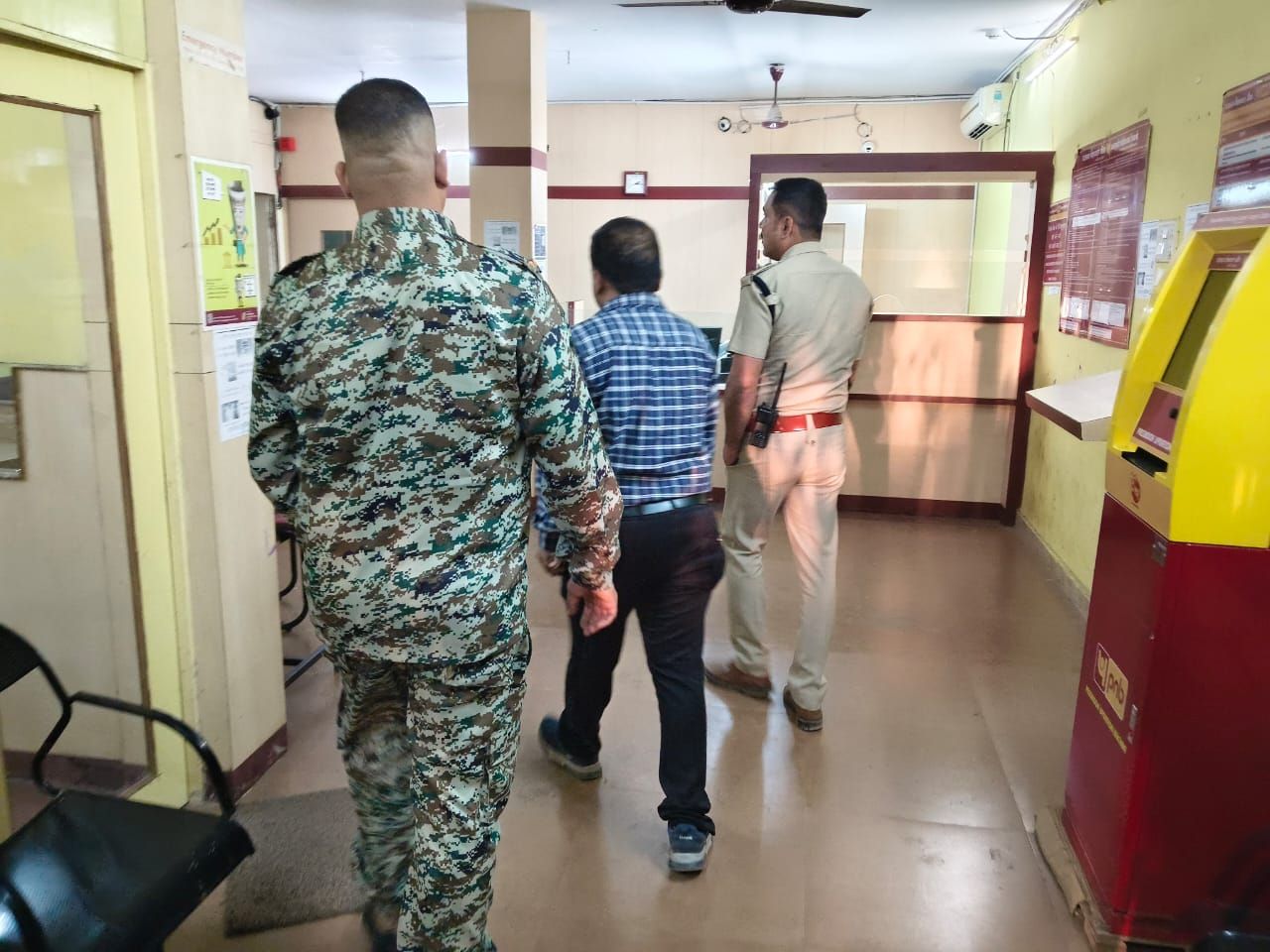 दोनों आरक्षक तत्काल बैंक की ओर पहुंचे, पुलिसकर्मियों को आता देख बाहर खड़ी गाड़ी को चालक ने स्टार्ट किया और तभी बैंक की ओर से एक व्यक्ति भागते हुए आकर वाहन में बैठा और तेजी से शहर की ओर फरार हो गया। स्थिति को गंभीर मानते हुए आरक्षकों ने तत्काल थाना प्रभारी जूटमिल निरीक्षक अभिनवकांत एवं पेट्रोलिंग में लगे प्रधान आरक्षक रामनाथ बनर्जी को सूचना दी। सूचना मिलते ही टीआई जूटमिल अभिनवकांत सिंह, प्रधान आरक्षक रामनाथ बनर्जी एवं थाना स्टाफ रायफल के साथ घेराबंदी के लिए मौके पर पहुंचे।