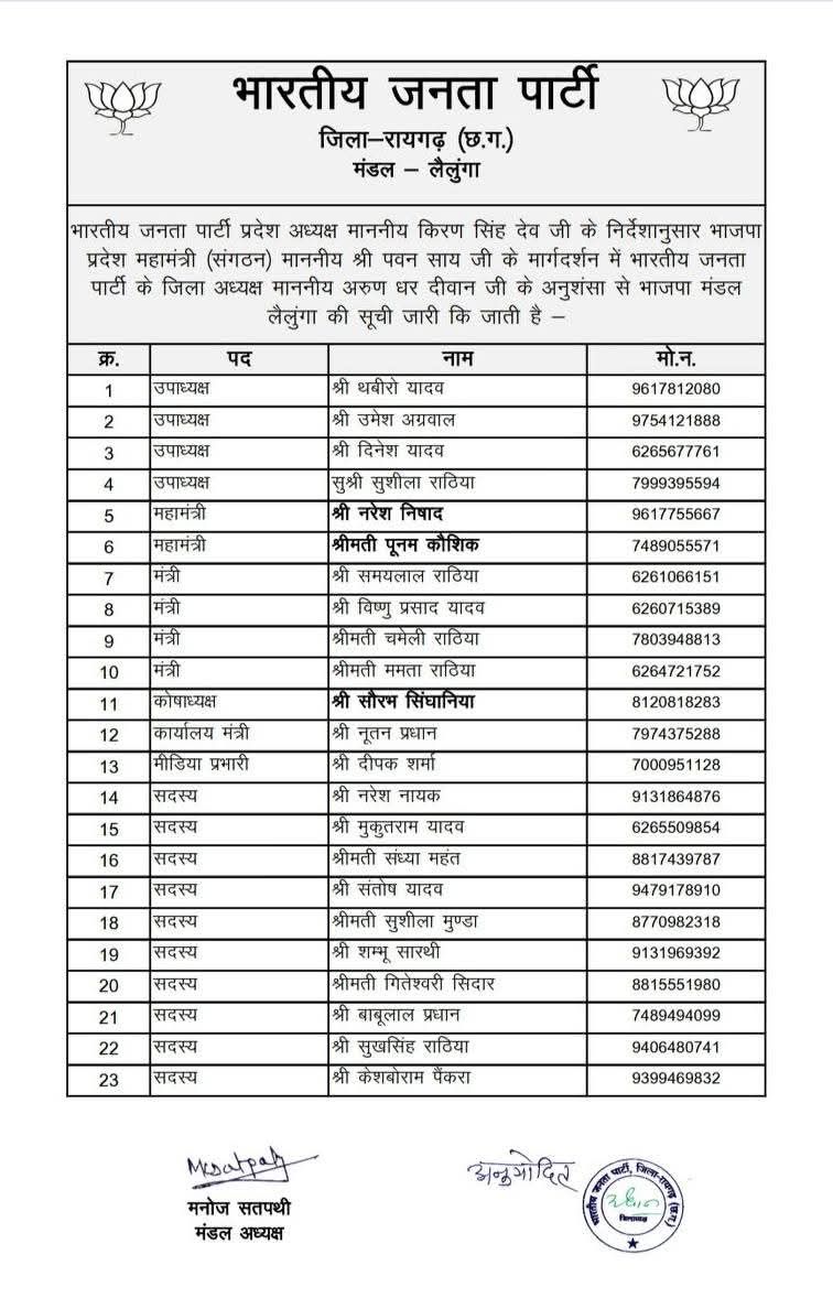 लैलूंगा भाजपा मंडल के पदाधिकारियो की सूची हुई जारी देखें सूची