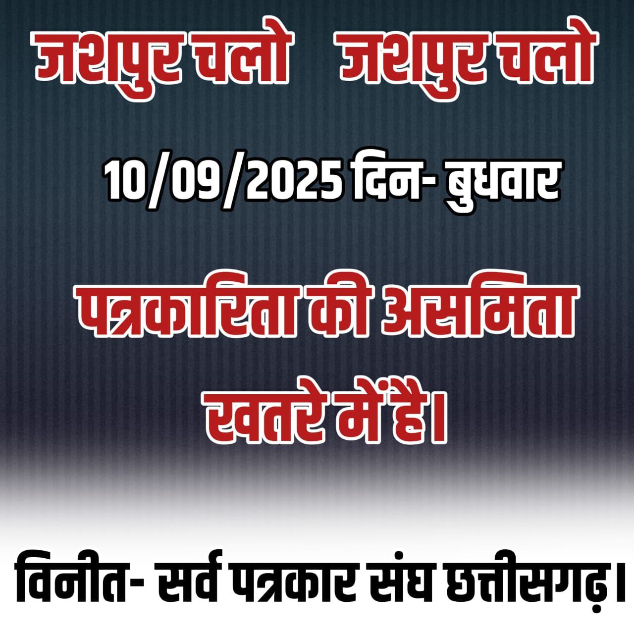 संयुक्त पत्रकार संघ ने प्रदेश के सभी पत्रकारों से अपील की है कि वे 10 सितम्बर को जशपुरनगर पहुँचकर इस ऐतिहासिक संघर्ष का हिस्सा बनें और लोकतंत्र की आवाज़ को बुलंद करें।