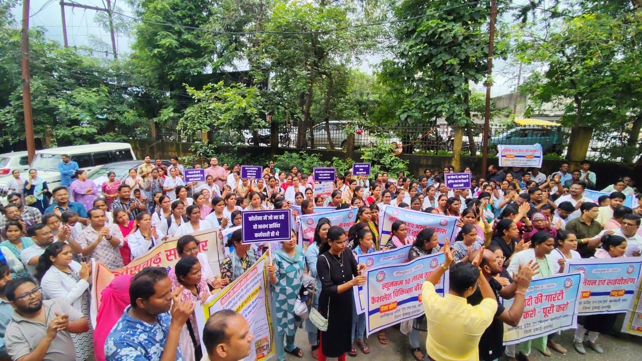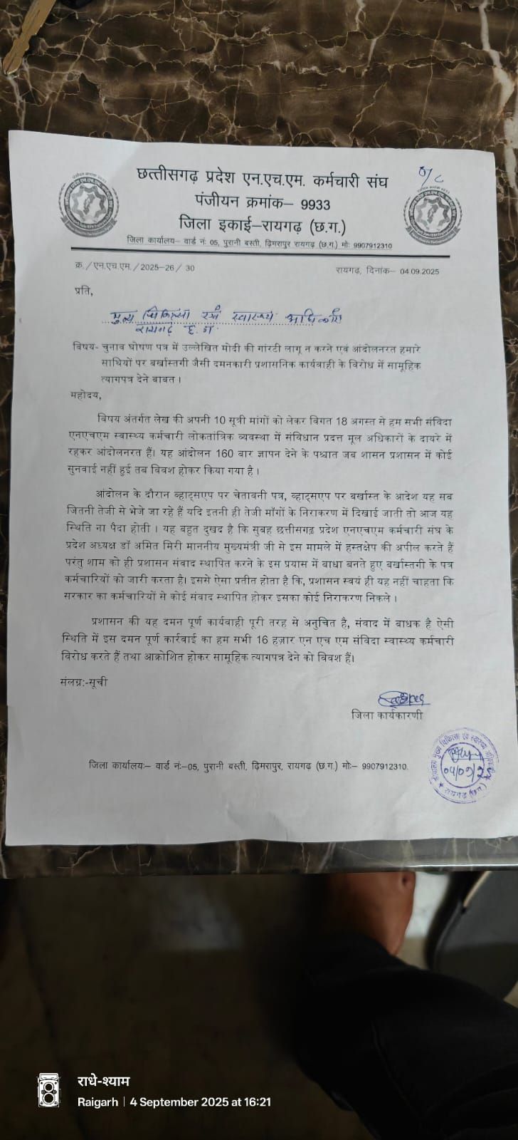 छत्तीसगढ़ के रायगढ़ जिले में राष्ट्रीय स्वास्थ्य मिशन (एनएचएम) के 518 संविदा स्वास्थ्य कर्मचारियों ने आज सामूहिक त्यागपत्र देकर शासन की अनदेखी और दमनकारी नीतियों के खिलाफ अपना रोष जाहिर किया है। विगत 18 अगस्त से हम अपनी 10 सूत्री मांगों को लेकर लोकतांत्रिक ढंग से, संविधान प्रदत्त अधिकारों के दायरे में आंदोलनरत हैं। 160 से अधिक बार ज्ञापन देने के बावजूद शासन की चुप्पी ने हमें यह कठोर कदम उठाने को मजबूर किया है।