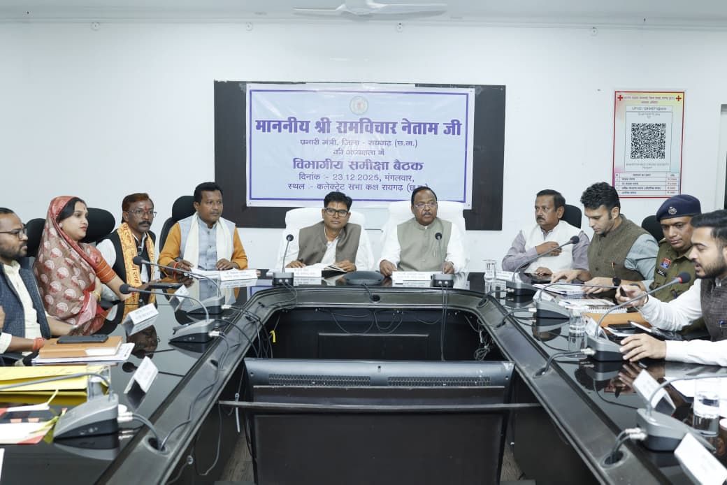 ायगढ़, 23 दिसम्बर 2025/ रायगढ़ जिले के प्रभारी मंत्री एवं राज्य शासन के कृषि तथा आदिम जाति विकास मंत्री श्री रामविचार नेताम ने कलेक्टोरेट कार्यालय के सभाकक्ष में राज्य शासन की प्राथमिकता वाली योजनाओं एवं कार्यक्रमों सहित तेरह महत्वपूर्ण विभागों के कार्यों की गहन एवं बिंदुवार समीक्षा की। प्रभारी मंत्री मंगलवार को जिले के एक दिवसीय प्रवास पर थे। समीक्षा बैठक में प्रदेश के वित्त मंत्री एवं रायगढ़ विधायक श्री ओ.पी.चौधरी ने भी विभागवार समीक्षा करते हुए अधिकारियों को आवश्यक दिशा-निर्देश दिए। बैठक में लोकसभा सांसद श्री राधेश्याम राठिया, राज्यसभा सांसद श्री देवेन्द्र प्रताप सिंह, महापौर श्री जीवर्धन चौहान, जिला पंचायत अध्यक्ष श्रीमती शिखा रविन्द्र गबेल, उपाध्यक्ष श्री दीपक सिदार, कलेक्टर श्री मयंक चतुर्वेदी, पुलिस अधीक्षक श्री दिव्यांग पटेल, जिला पंचायत सीईओ श्री अभिजीत बबन पठारे, आयुक्त नगर निगम श्री बृजेश सिंह क्षत्रिय सहित विभागीय अधिकारी एवं वरिष्ठ प्रशासनिक अधिकारी विशेष रूप से उपस्थित रहे।