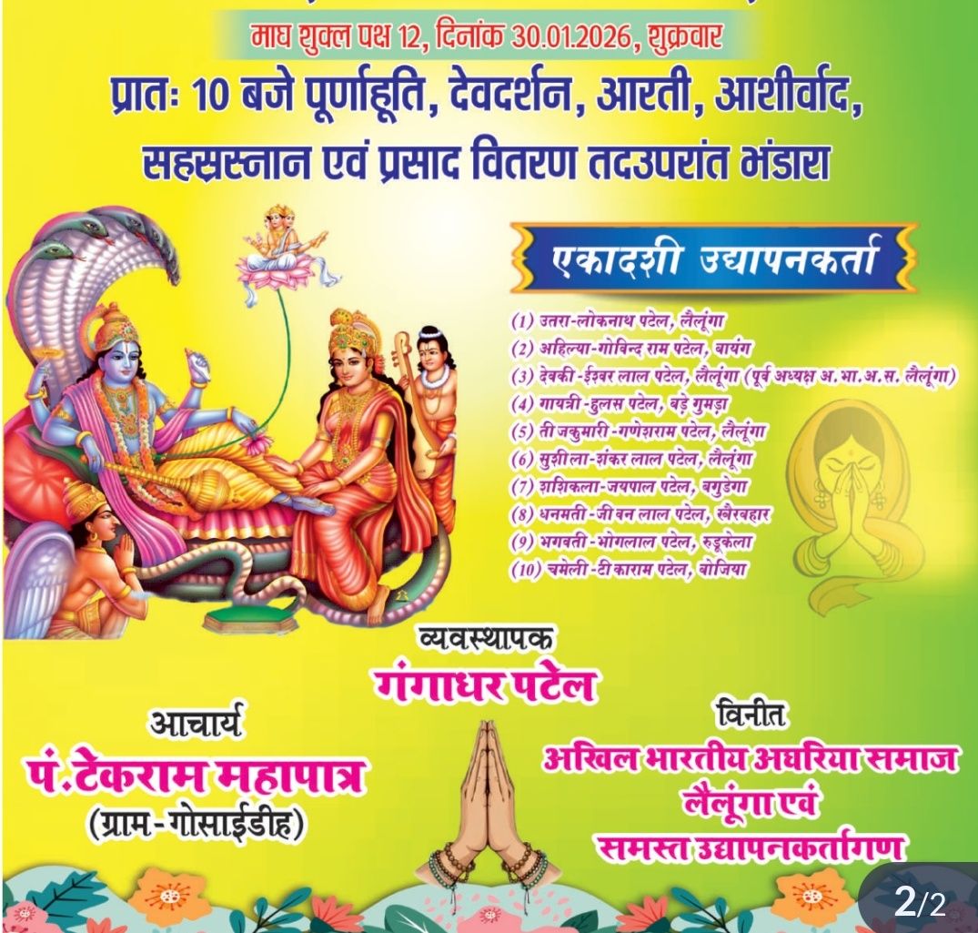 लैलूंगा में इन दिनों भक्ति, श्रद्धा और धार्मिक उल्लास का अद्भुत दृश्य देखने को मिल रहा है। श्री राधाकृष्ण की कृपा से आयोजित तीन दिवसीय एकादशी धार्मिक महोत्सव ने पूरे क्षेत्र को भक्तिमय बना दिया है। यज्ञ, हवन, पूजन, दीपयज्ञ, आरती और एकादशी महातम्य कथा के साथ गांव-गांव से श्रद्धालुओं का सैलाब उमड़ पड़ा है।