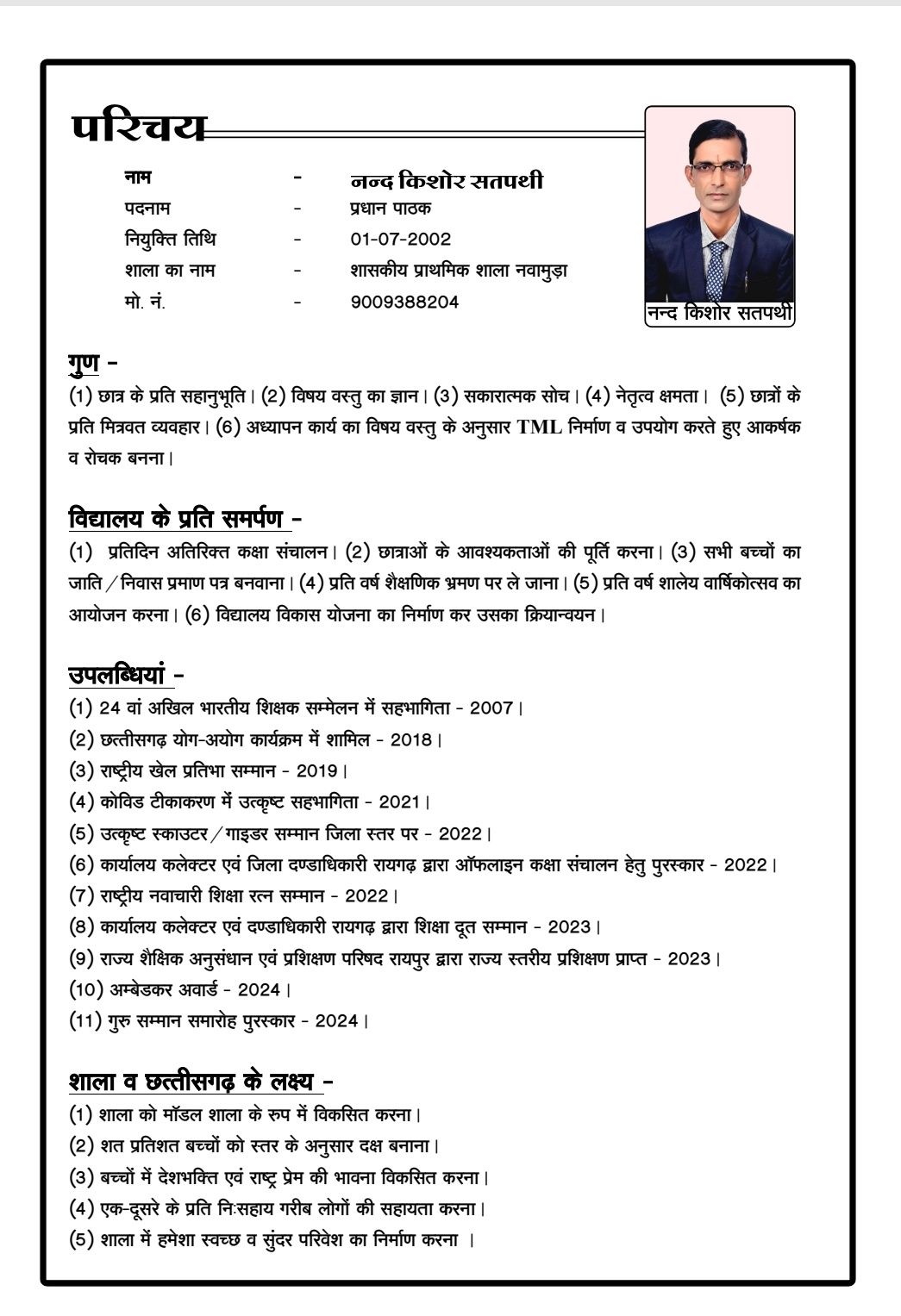 नन्द किशोर सतपथी ने 01 जुलाई 2002 को अपनी सेवा यात्रा की शुरुआत की थी। दो दशक से अधिक के लंबे सफर में उन्होंने बच्चों को सिर्फ किताबों तक सीमित नहीं रखा, बल्कि उनके सर्वांगीण विकास पर ध्यान दिया। खेल, नैतिक शिक्षा, सांस्कृतिक गतिविधियाँ और आधुनिक शिक्षण पद्धतियों को कक्षा में लागू कर उन्होंने शिक्षा को रोचक और जीवन से जुड़ा बनाया।