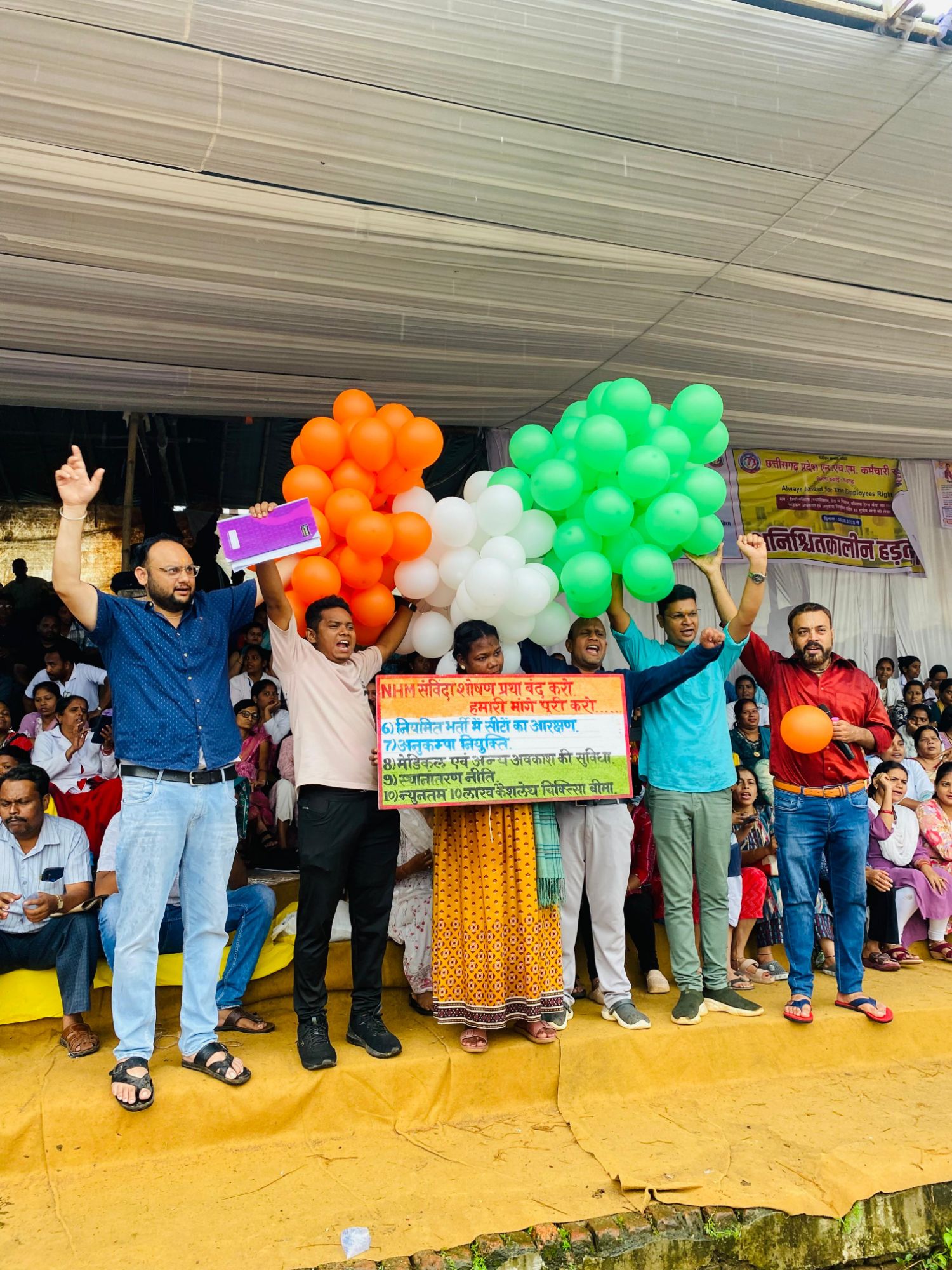 रायगढ़: छत्तीसगढ़ प्रदेश एन.एच.एम. कर्मचारी संघ की जिला इकाई-रायगढ़ के बैनर तले 16,000 से अधिक राष्ट्रीय स्वास्थ्य मिशन (एन.एच.एम.) कर्मचारी 18 अगस्त 2025 से अनिश्चितकालीन हड़ताल पर हैं। हड़ताल के छठे दिन, 23 अगस्त 2025 को शहीद कर्नल विप्लव त्रिपाठी मिनी स्टेडियम में जिले के 550 से अधिक कर्मचारियों ने गुब्बारे हवा में छोड़कर 20 वर्षों की शोषण प्रथा को समाप्त करने हेतु सरकार का ध्यान आकर्षित किया। गुब्बारों के साथ अपनी 10 सूत्रीय मांगों को प्रतीकात्मक रूप से हवा में छोड़ा गया, जो सरकार के खोखले वादों की तरह अब तक अनसुलझी हैं।