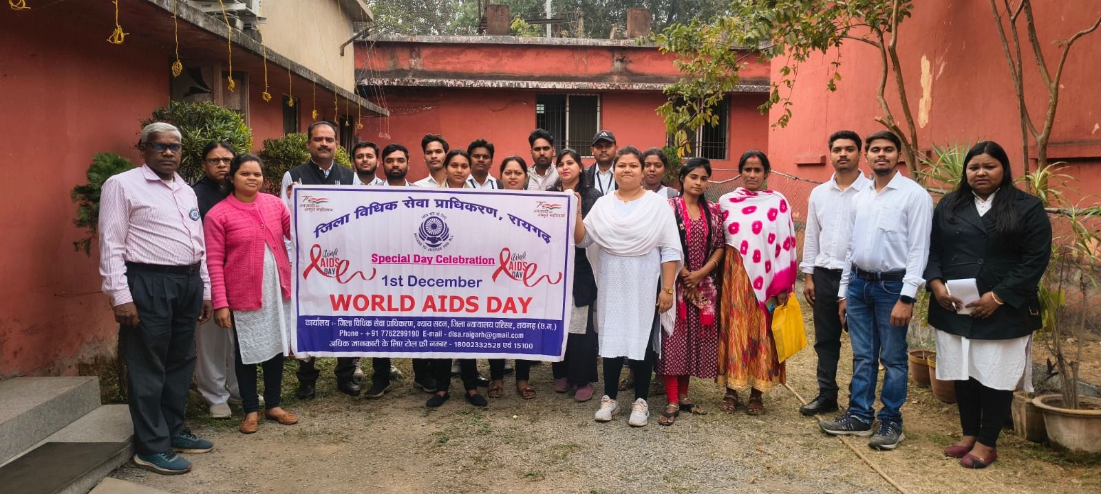इस अवसर पर जिला न्यायालय परिसर रायगढ़ में जिला विधिक सेवा प्राधिकरण, रायगढ़ के कर्मचारीगण एवं पैरालीगल वालिंटियर्स द्वारा विश्व एड्स दिवस मनाया गया। जिला न्यायालय परिसर रायगढ़ में उपस्थित विधि के छात्र-छात्राएं एवं परिसर में उपस्थित आमजनों के साथ एचआईवी संक्रमण के बारें में जागरूकता लानेे एवं एड्स के बारे में शिक्षित करने और इस बीमारी के प्रसार को रोकने के लिए प्रयास करने हेतु जानकारी दिया गया। इसी अनुक्रम में प्राधिकरण का मुख्य कार्यो से नालसा द्वारा संचालित योजनाओं के संबंध में जानकारी प्रदान किया गया, आपदा पीड़ितों को विधिक सेवा सहायता, यौन शोषण पीड़ितों के लिए विधिक सेवाएं, श्रमिकों के लिए विधिक सेवाएं, मानसिक रूप से बीमारी और मानसिक रूप से विकलांग व्यक्तियों के लिए विधिक सेवाएं ,संवाद, डॉन, जागृति के बारे में लोगों को निःशुल्क कानूनी सहायता एवं नालसा, सालसा की समस्त योजनाओं से अवगत कराना है। इस प्राधिकरण द्वारा यहॉ महिलाओं को विशेष सुरक्षा एवं सहायता दी जाती है। इस अवसर पर जिला विधिक सेवा प्राधिकरण, रायगढ़ के कर्मचारीगण श्री गिरीश साहू, श्री देवनंदन साहू, श्री रविन्द्र बेहरा, श्री उजागर सिंह चौहान, एवं पैरालीगल वालिंटियर्स, हरीश षडंगी, आयुश देवांगन, रश्मि बेहरा, वृहस्पति सिदार, तरूण बेहरा लीगल एड डिफेंस कौंसिल के स्टॉफ भ्रमर गुप्ता, रमेश कुमार डनसेना, अभिषेक शर्मा, विधि के छात्र-छात्राएं एवं जनसामान्य उपस्थित रहे।
